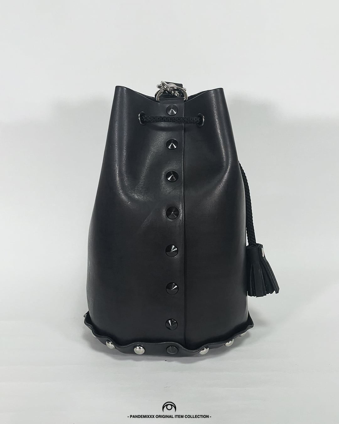 黒レザーとメタルパーツの組み合わせの巾着バッグ。