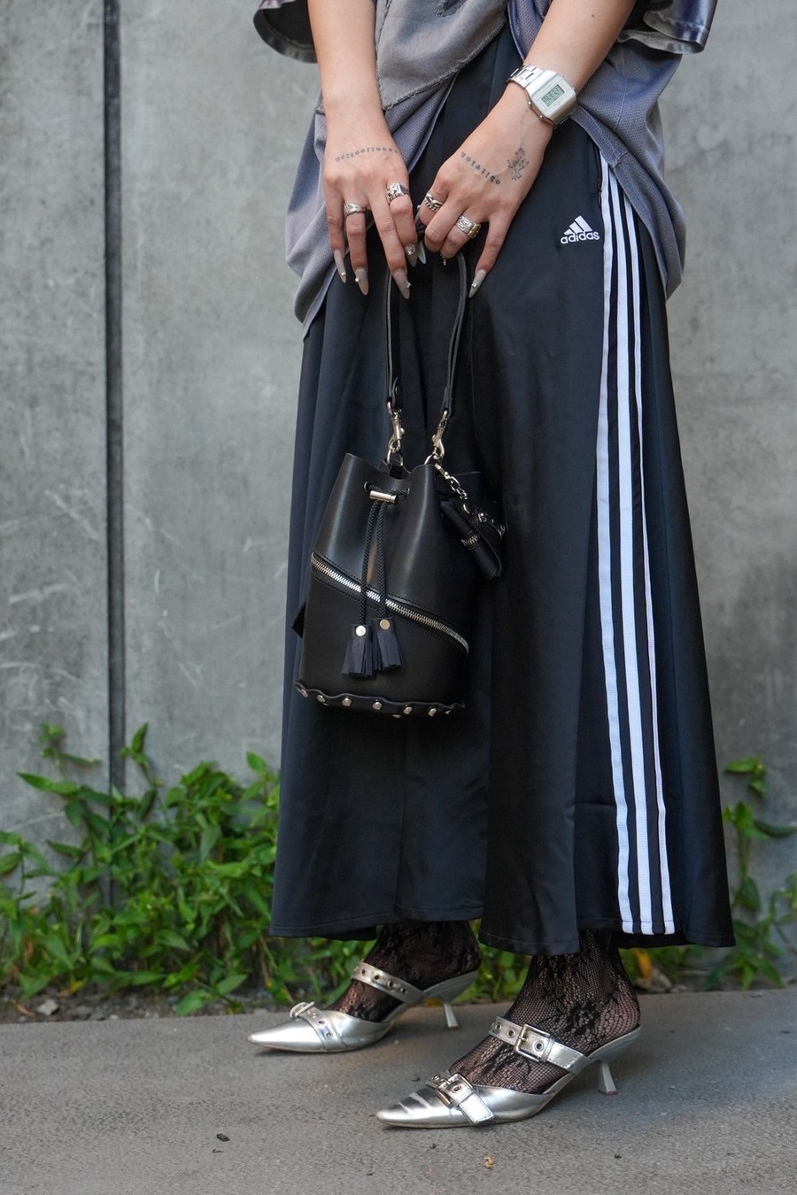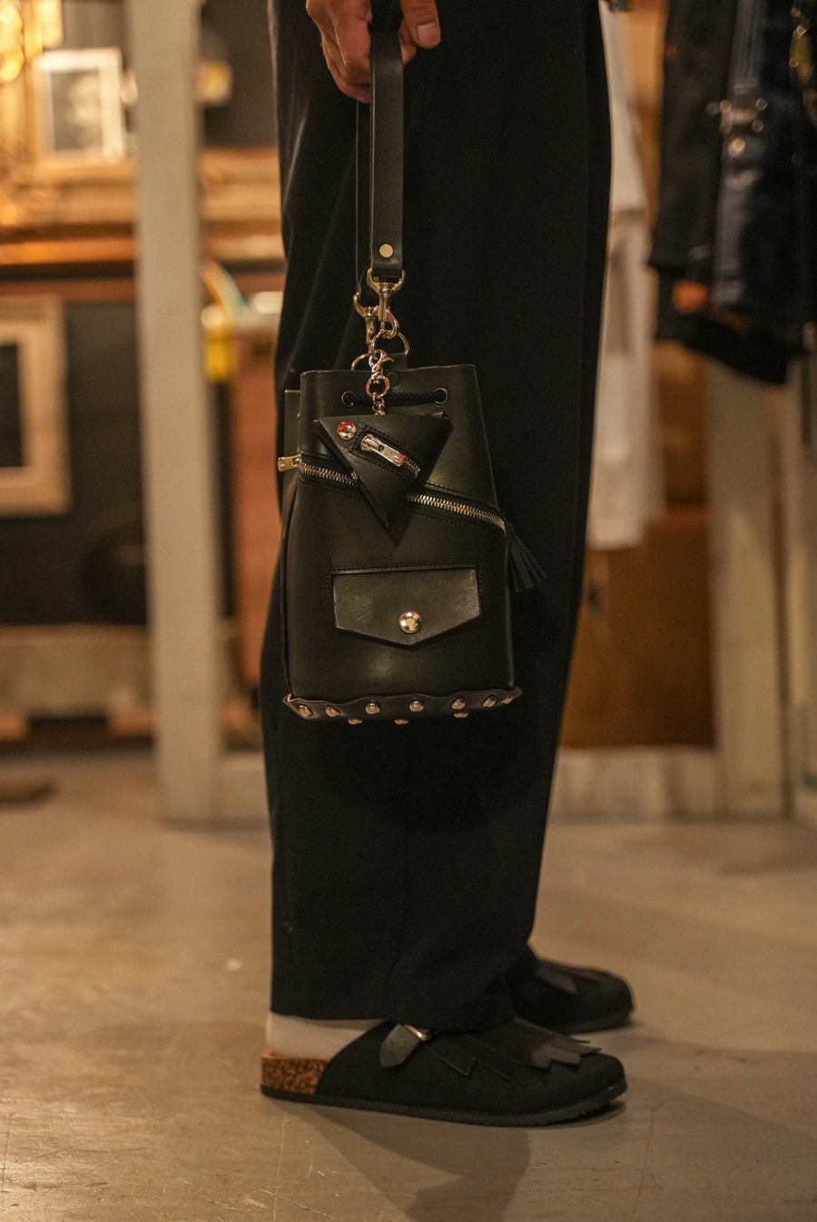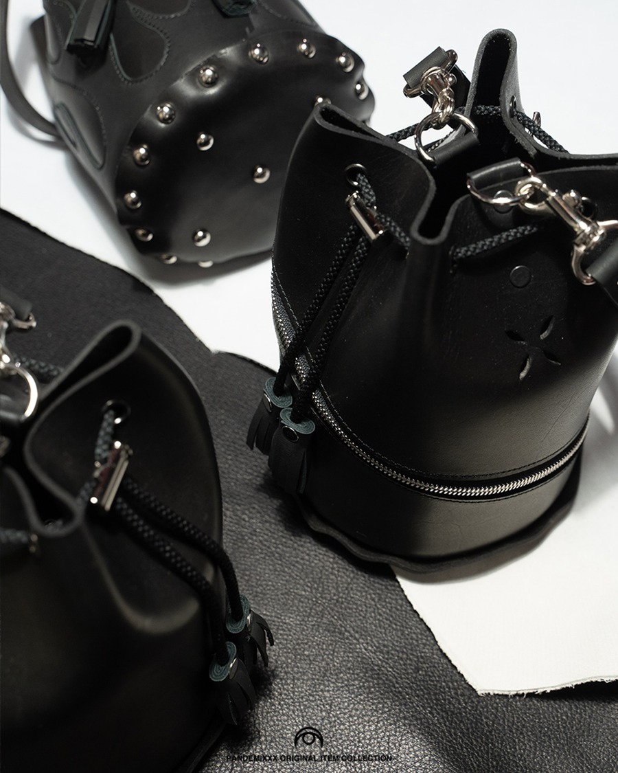 ヌメ革を使用し、黒に染め上げた巾着バッグ。Ridersモチーフなのでファスナーとコインポケットが特徴のデザインです。