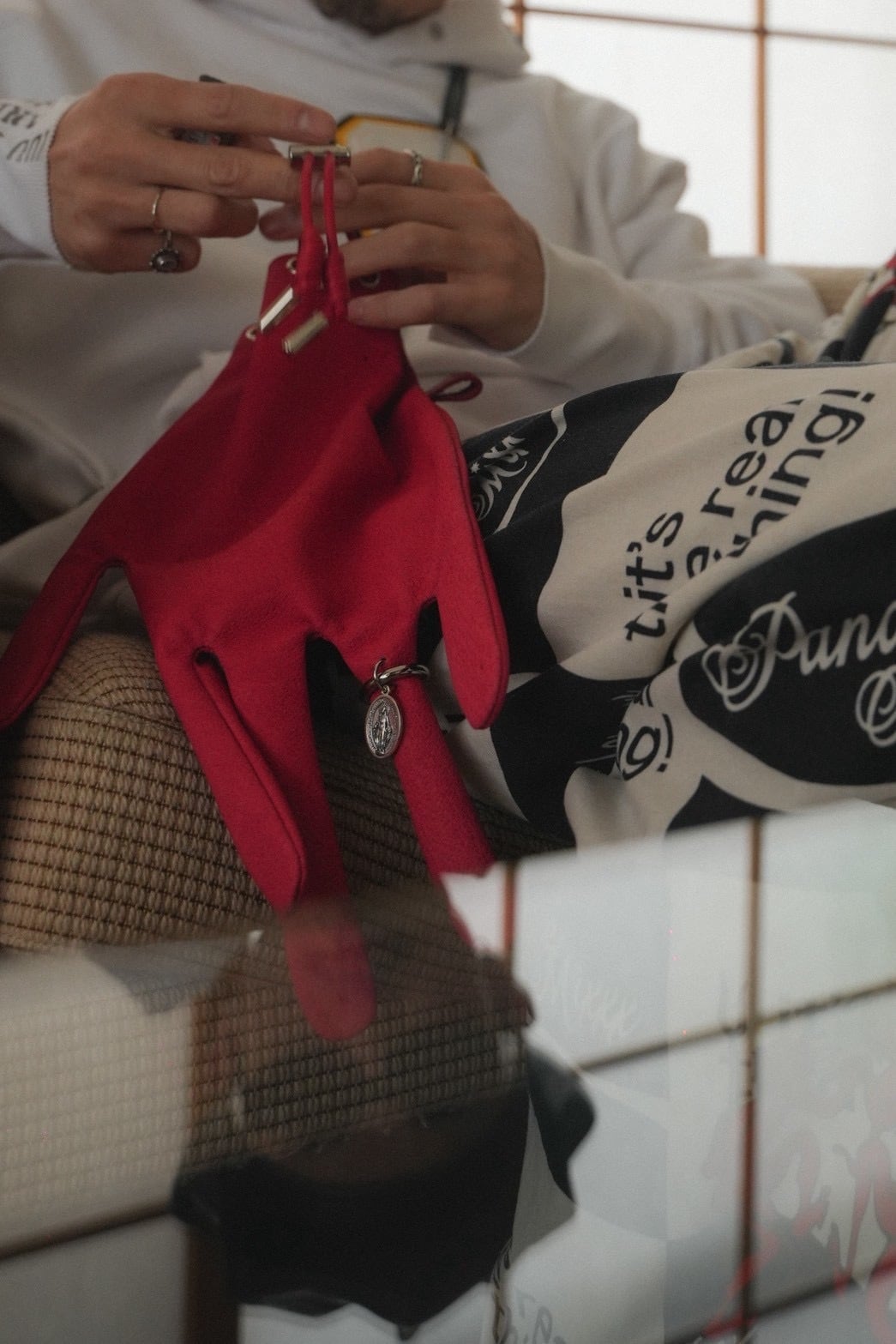 手形のバッグだけあり、インパクトはもちろんのこと、コーディネートにちょっとした気持ち悪さをプラス出来ます。主役に見られがちですが相当インパクトのある脇役の立ち位置が丁度良いポジションです。