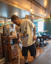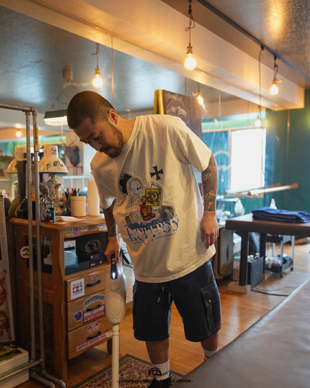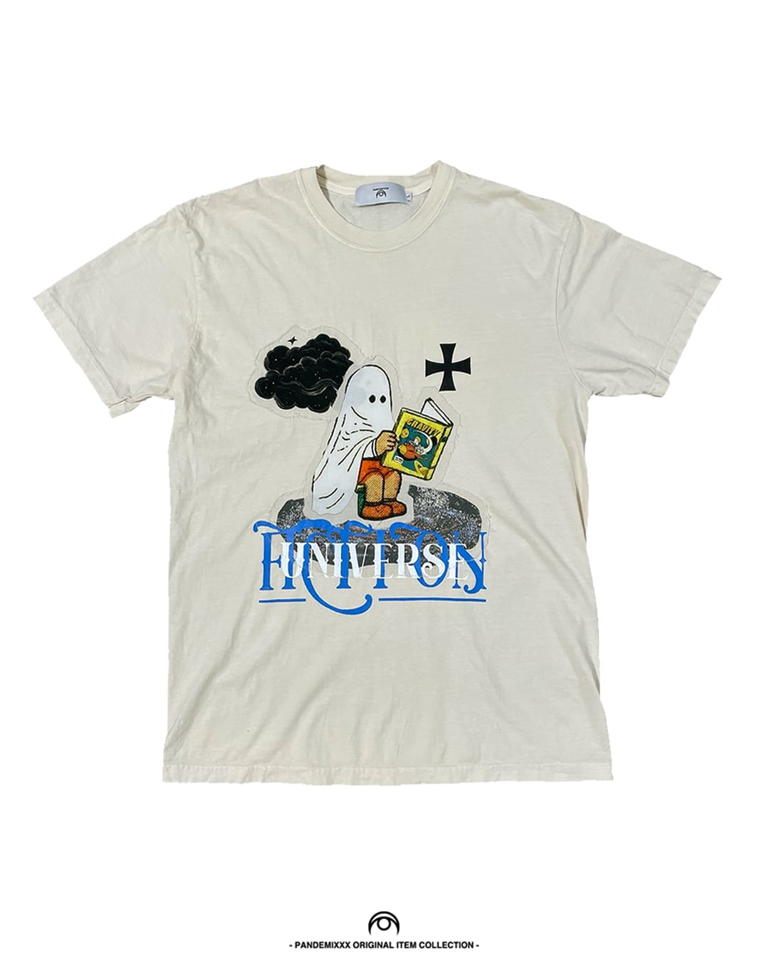コラージュデザインが魅力の「FICTION」は、製品染めソフトウォッシュ加工が施されており、着るたびに独自の風合いが生まれます。洗濯ネットでのお手入れが可能で、取り扱いも簡単です。また、色移りの可能性がありますので、他の衣類とは分けて洗うことをお勧めします。長く愛用できる一枚を、ぜひお楽しみください!